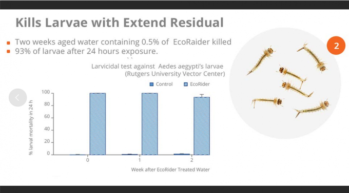 وقد أوضحت الدراسة أنه عند جرعة منخفضة للغاية (تصل إلى 1000 مرة من التخفيف) فإن ORO "فعال في قتل 100٪ من اليرقات المعرضة لمدة 24 ساعة بعد أسبوع واحد من معالجة المياه" و "بقايا الأسبوع الثاني قتل 93٪ من اليرقات المختبرة. ومع ذلك ، كانت اليرقات التي نجت بعد موتها خلال 48 ساعة. "